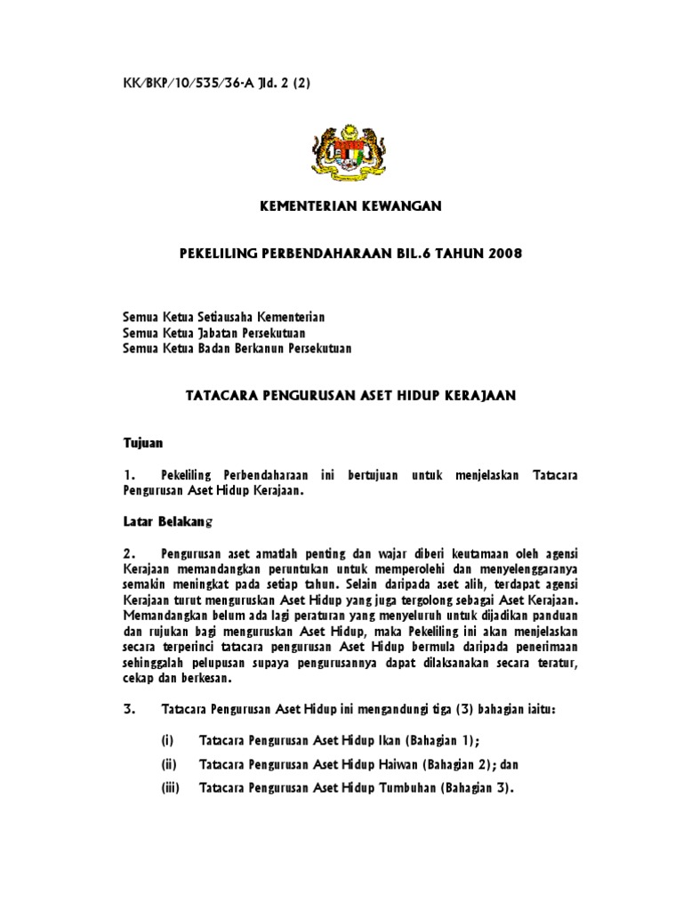 Pekeliling Perbendaharaan Bil 6 2008 Tatacara Pen Gurus An Aset Hidup Kerajaan Pdf