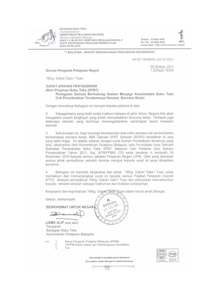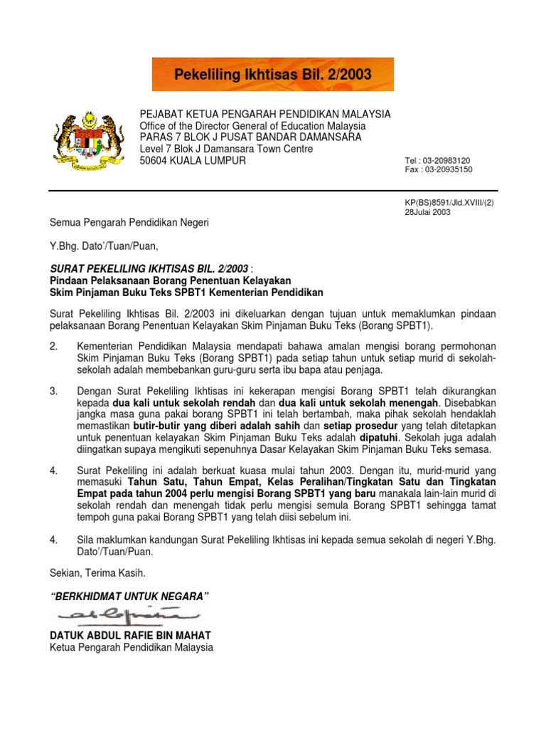 Arahan Pentadbiran berkaitan SPBT Contoh. Pindaan syarat kelayakan meminjam buku teks skim pinjaman buku teks spbt kementerian pelajaran malaysia. SURAT ARAHAN PENTADBIRAN-TEMPOH GPSPBT.